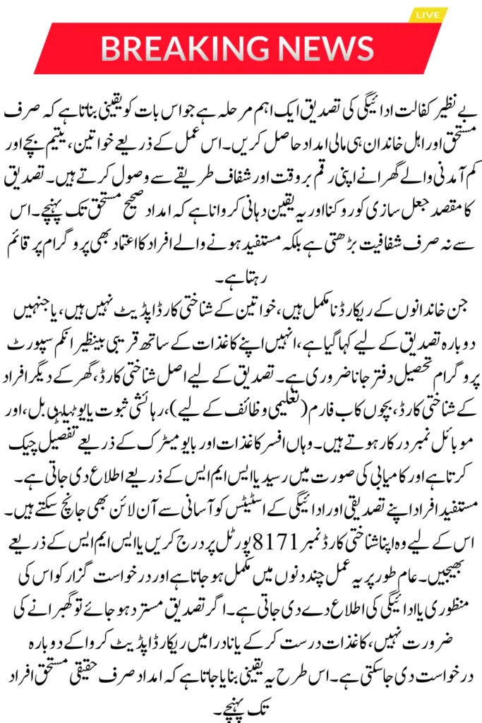 Verification is an important step in the Benazir Kafaalat Program because it ensures that only eligible and deserving families receive financial support. By confirming identity and family details, the program prevents fraud and guarantees that funds reach the right people.