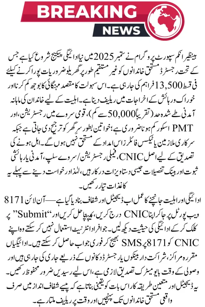 The Government of Pakistan has announced a new update for the BISP 8171 program in September 2025. Under this scheme, registered families will receive financial aid of Rs. 13,500 to manage food and household needs. This step aims to reduce the burden of inflation on poor households and support them with direct cash relief.
