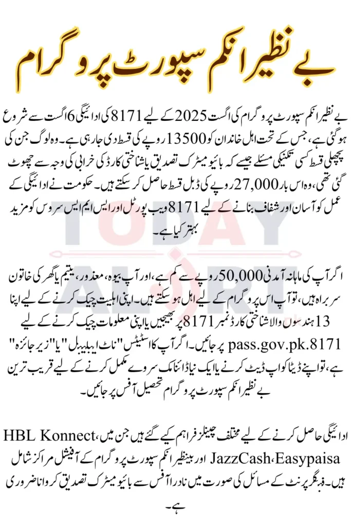 BISP 8171 Payment August 2025 installment has started from August 6, and the Government of Pakistan has taken new steps to make the payment process more transparent, fast and easy this time. Eligible families are being given the usual installment of Rs 13,500, while those whose previous installment was stopped due to some reason (such as biometric issue or ID card error), can also get a double payment of Rs 27,000 this time.