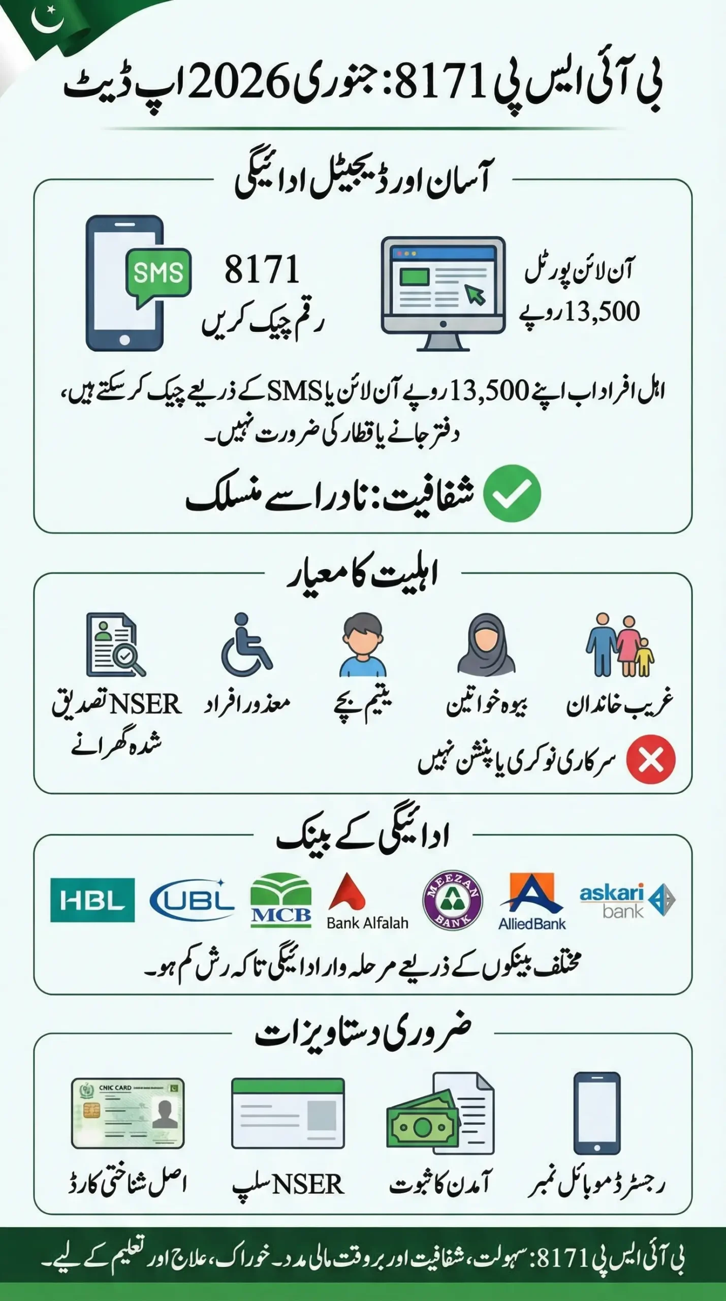 BISP 8171 January 2026 provides a transparent, digital and efficient system for low-income families to receive timely financial assistance. With online and SMS verification, scheduled bank payments, and simple documentation requirements, eligible households can access their Rs. 13,500 installments immediately, supporting essential needs such as food, healthcare, and education.