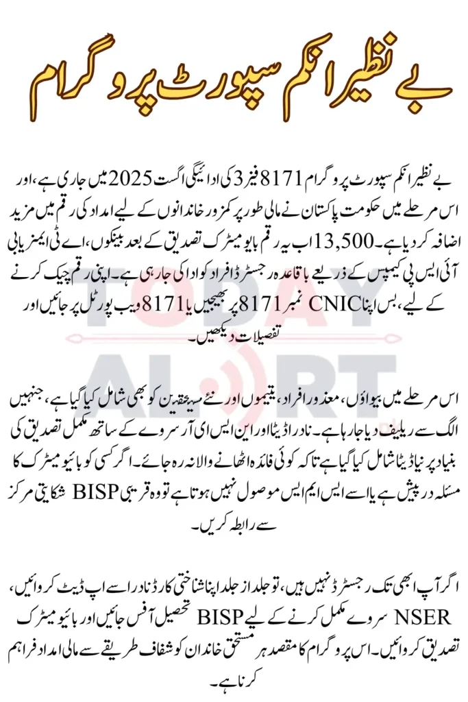 | Regular Beneficiaries | 13,500 | 10 August 2025 | BISP Payment Centers, ATMs |