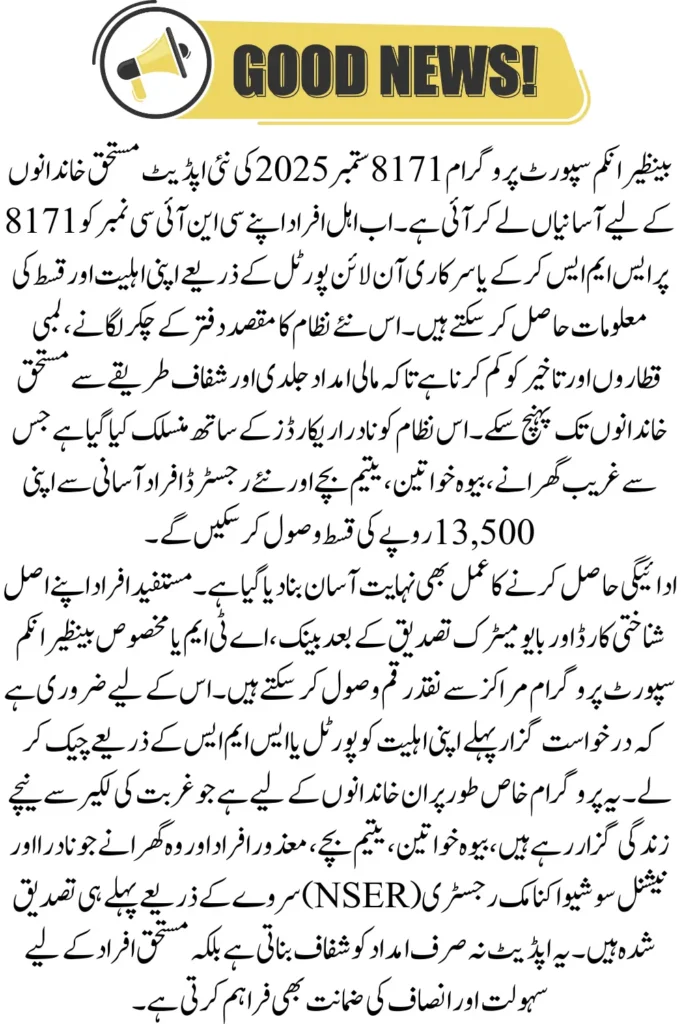 The BISP 8171 September 2025 update has made it easier for deserving families to access financial assistance quickly and transparently. With digital verification through CNIC, SMS and online portals, beneficiaries can check their status at any time without having to stand in long queues. This step marks a significant step towards efficiency and fairness in financial assistance to vulnerable families.
