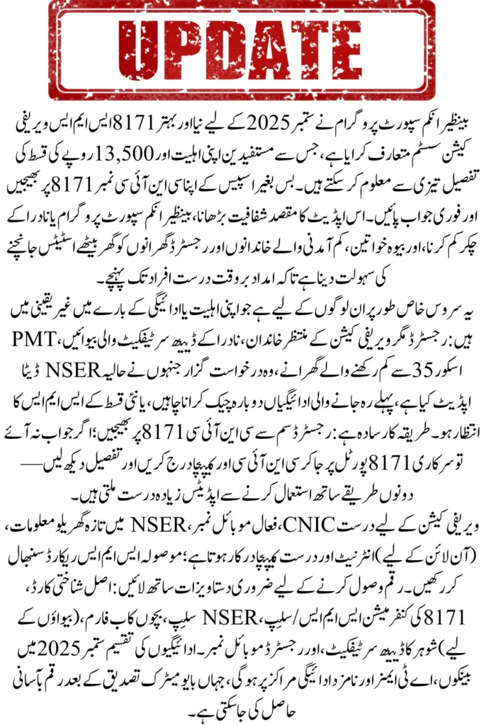 The BISP 8171 SMS Verification system for September 2025 has made eligibility checks and payment updates faster and more transparent. By using a simple CNIC-based SMS or the online portal, poor families, widows, and deserving households can confirm their status without unnecessary office visits.