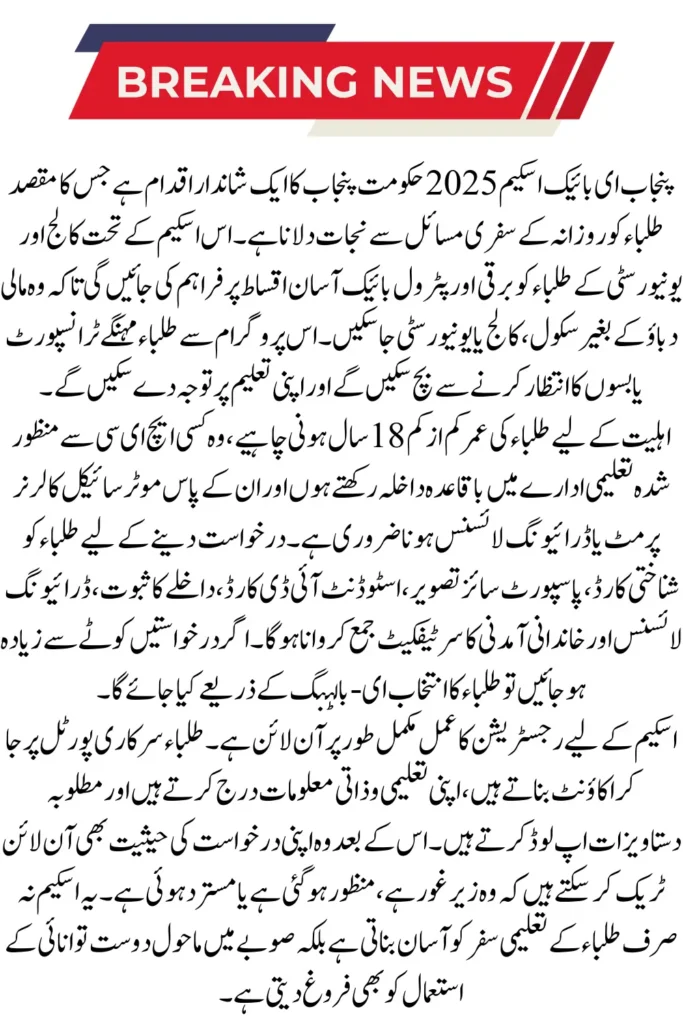 The Punjab government has launched the Punjab E-Bike Scheme 2025 to help students facing daily travel problems. The scheme provides electric and petrol bikes on easy installments, making it affordable for students to reach schools, colleges and universities without financial pressure. It aims to reduce transport problems and help the youth continue their education with ease.