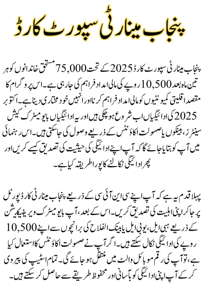 Punjab Minority Card Payment program is an essential initiative for supporting minority households in Punjab. By following this step-by-step guide, you can easily withdraw your Rs. 10,500 payment using biometric verification, partner banks, or Sahulat accounts. Make sure to follow all eligibility requirements and safety tips to ensure a smooth and secure experience. This initiative reflects the Punjab Government’s commitment to providing financial relief and empowerment to marginalized communities.