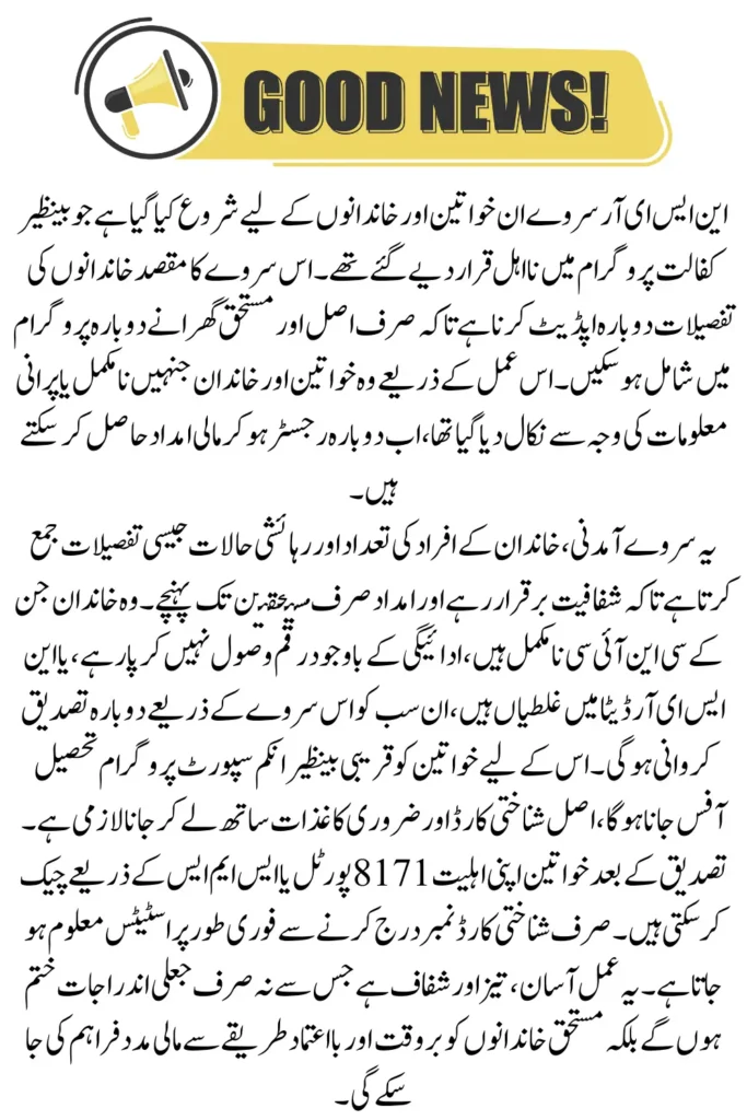 The NSER survey has been introduced as a fresh update for women who have been declared ineligible under the Benazir Kafalat program, giving them another opportunity to seek support. The survey helps in verifying and updating family details, so that only eligible women and households can be re-enrolled. By updating the information, those who were previously left out due to incomplete or outdated records can now re-apply and become eligible.