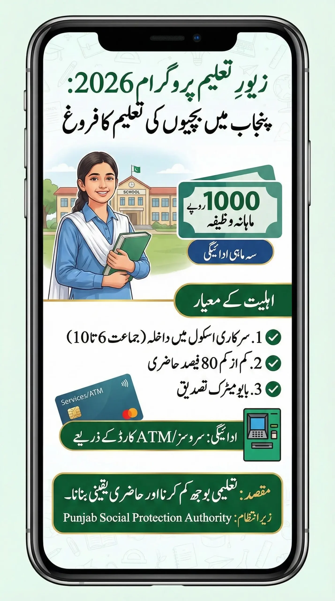 Eligibility depends on 80% attendance, poverty status, and verified school records. The program targets low-literacy districts and is implemented by the Punjab Social Protection Authority. This initiative helps families manage uniforms, books, and daily school expenses while reducing dropout rates among girls.